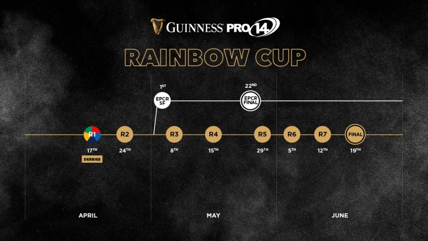 The Guinness PRO14 Rainbow Cup will kick off on April 17 with two pools of 8 teams made up of two Irish, two South African, two Welsh, one Italian and one Scottish club. Each team will play one game against each pool opponent and the sides that finish top of their pools will face off in a final on June 19.